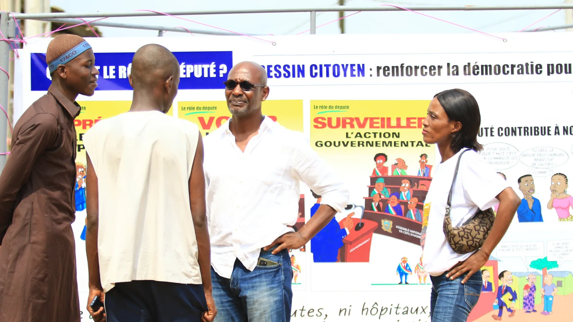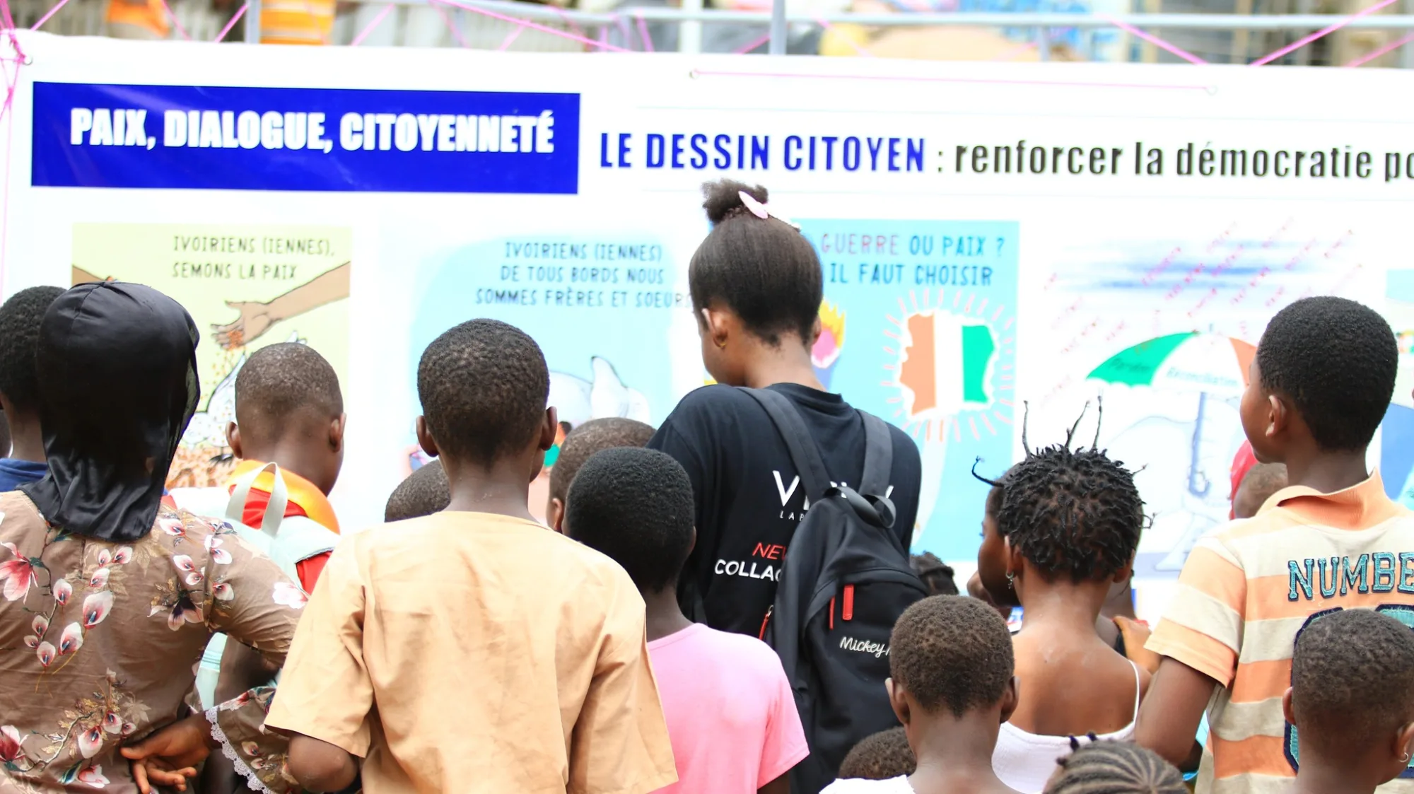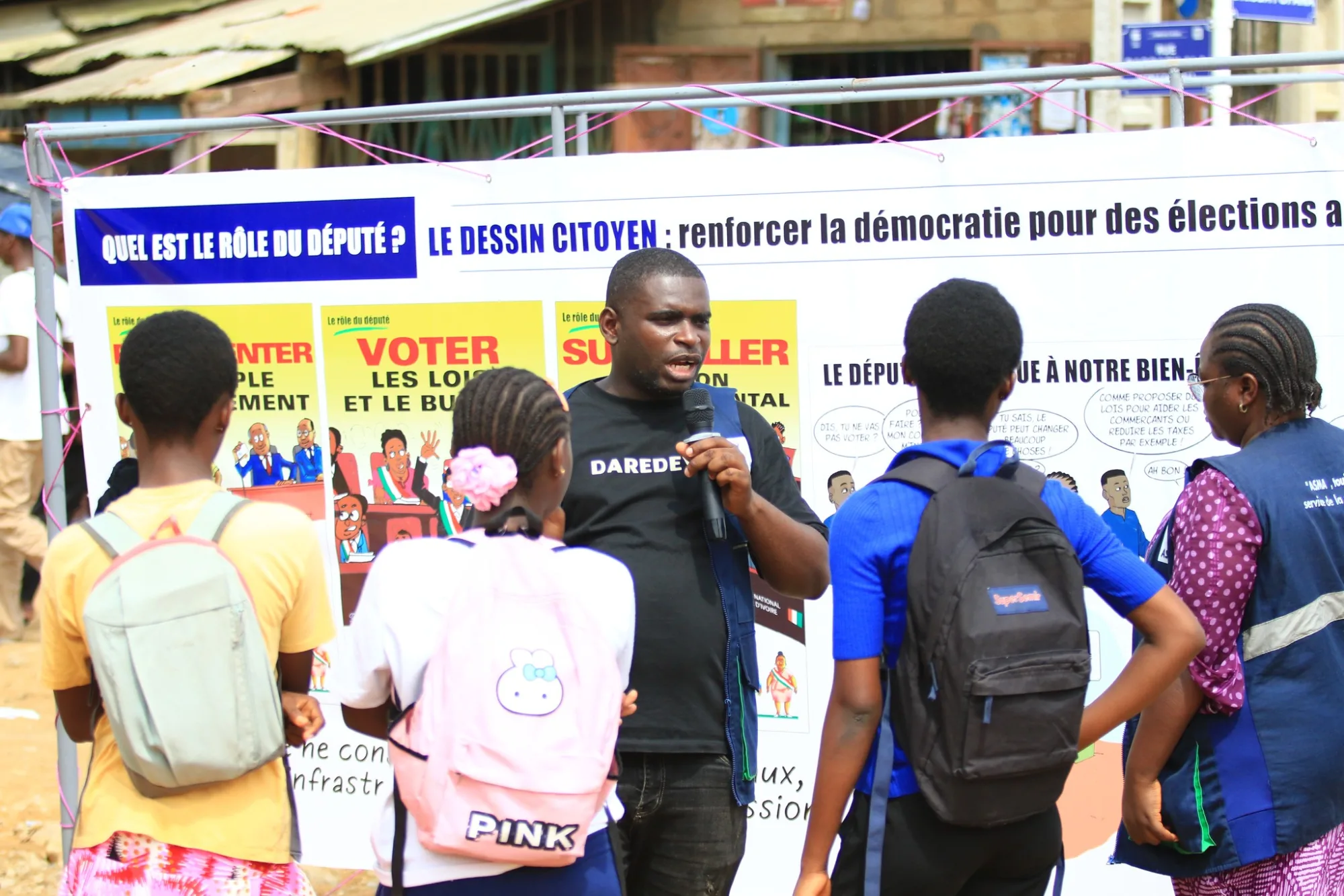 L’activité financée par l’UNION EUROPÉENNE qui comprend une exposition de dessins de sensibilisation sur la démocratie et le rôle des députés, des débats avec le public et des ateliers de dessins se déroule durant une journée et vise trois communes d’Abidjan : Abobo, Yopougon et Cocody. L’étape d'Abobo a eu lieu le Samedi 13 décembre.