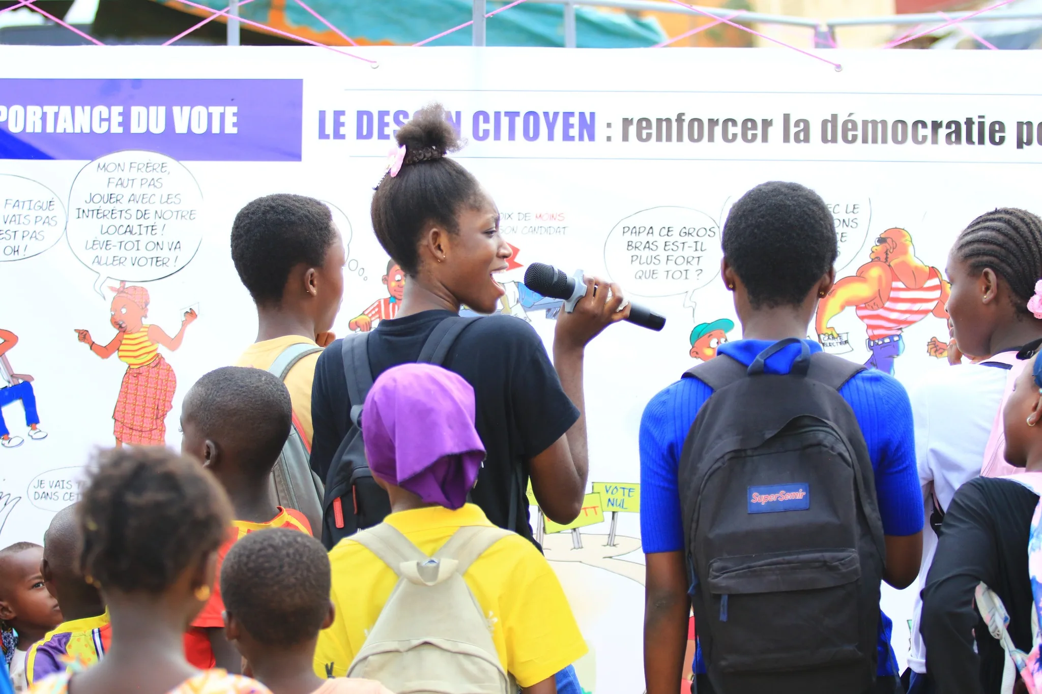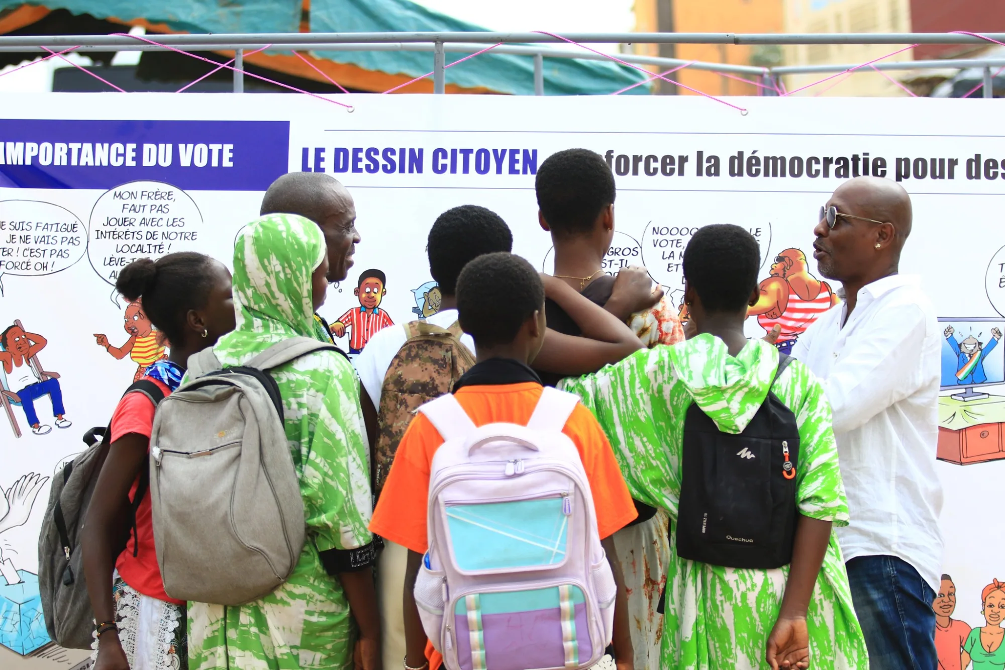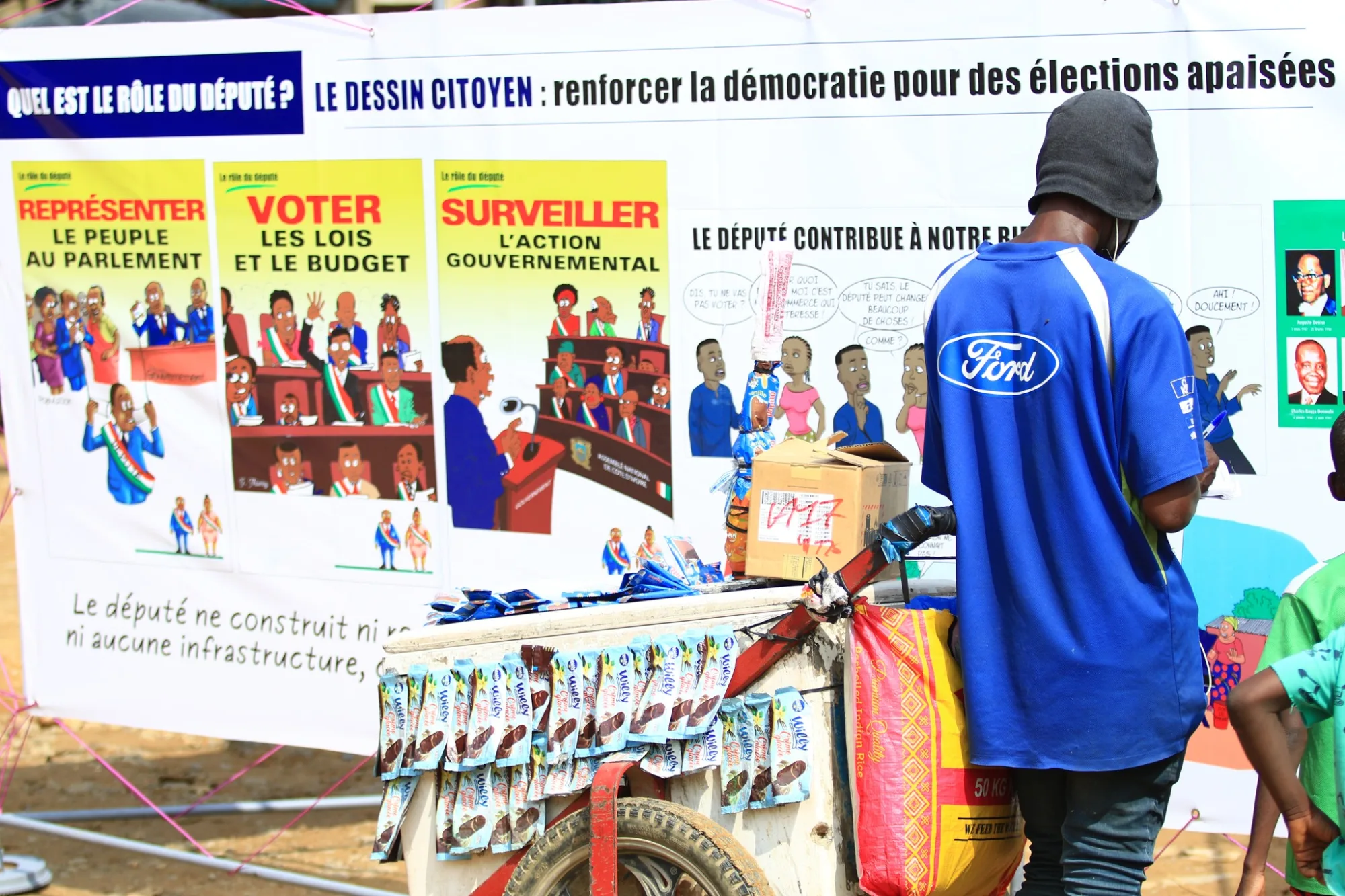 L’activité financée par l’UNION EUROPÉENNE qui comprend une exposition de dessins de sensibilisation sur la démocratie et le rôle des députés, des débats avec le public et des ateliers de dessins se déroule durant une journée et vise trois communes d’Abidjan : Abobo, Yopougon et Cocody. L’étape d'Abobo a eu lieu le Samedi 13 décembre.
